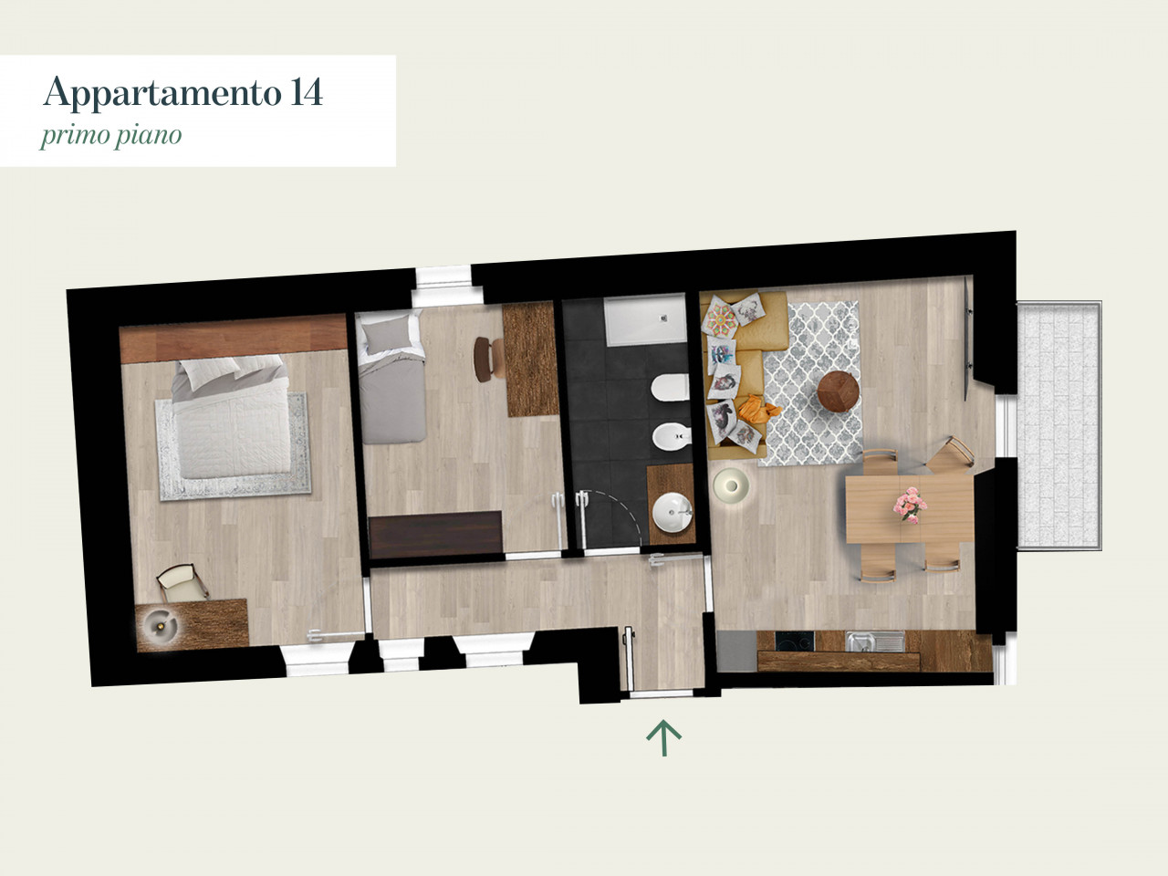 L’unità 14 si compone da ingresso sul corridoio, zona living con cucina a vista e poggiolo, camera matrimoniale, camera singola e bagno completo con wc.